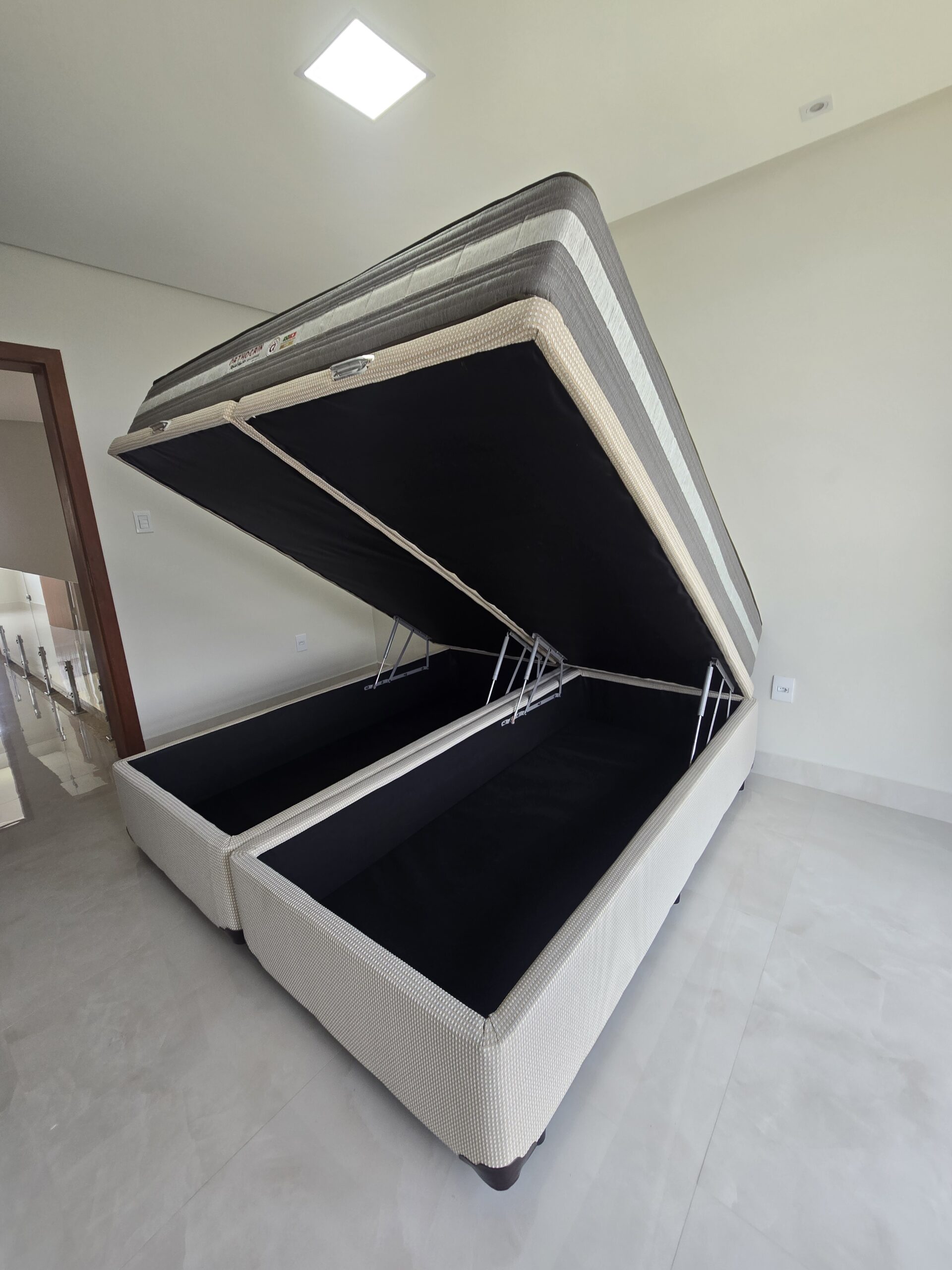 Indicado para quem precisa de mais espaço para guardar roupas de cama, travesseiros e cobertores, mala de viagem, escada, arvore de natal, e outros itens. Sem perder o conforto e a estética do quarto. Ideal para cama king size, com abertura facilitada por pistões a gás e estrutura reforçada para estabilidade.