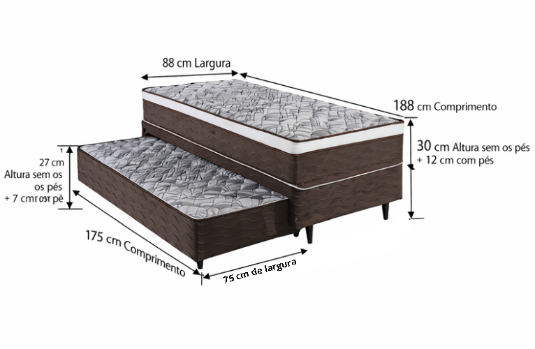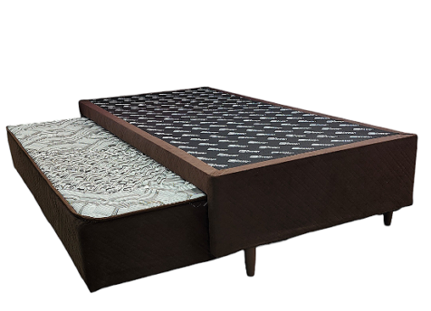 Este produto é composto por uma cama principal (box) que não acompanha colchão, sendo necessário adquirir o colchão separadamente. Abaixo do box principal, há uma cama auxiliar, que já vem pronta para uso e não precisa de colchão adicional. A cama auxiliar é com espuma D28, suportando até 120 kg. Para utilização, a cama auxiliar é puxada por duas alças quando está guardada sob o box principal. Importante: este modelo não possui rodinhas.