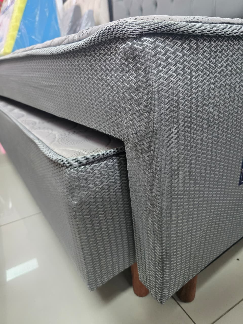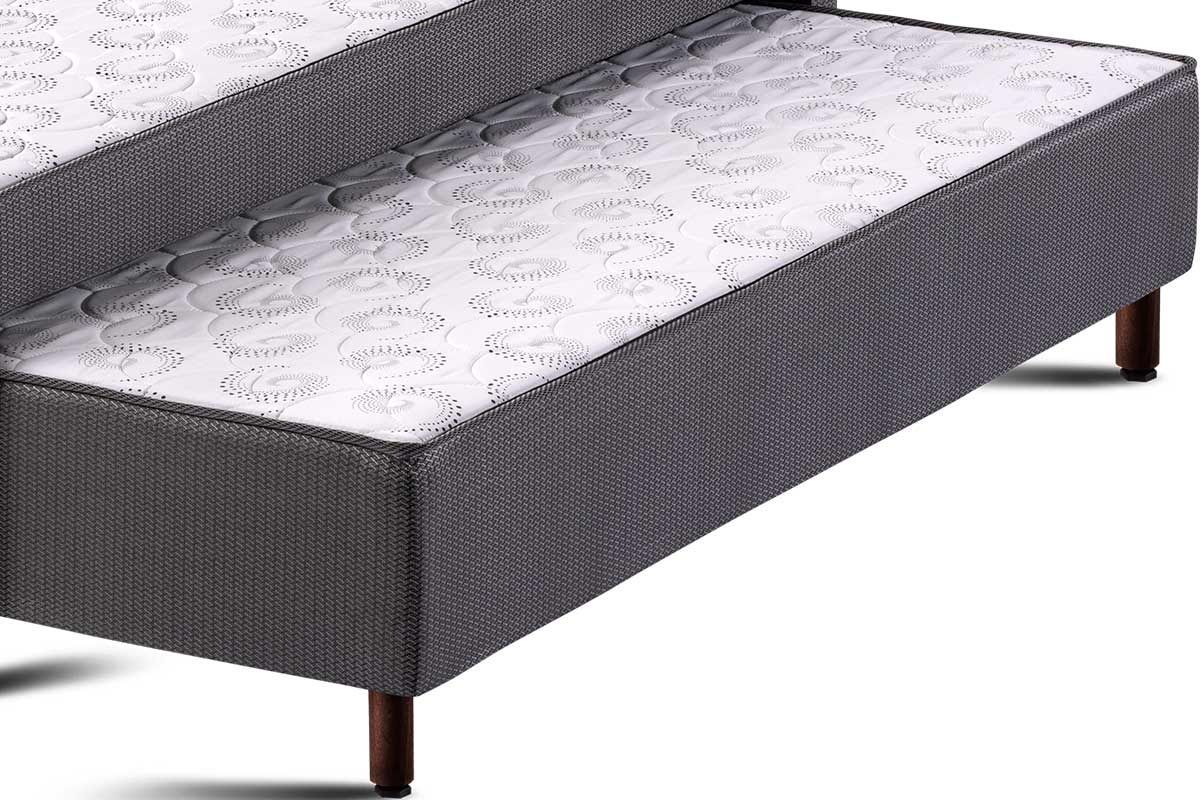Este produto é composto por uma cama principal (box) com 5 centímetros de espuma D28 de poliuretano. A cama auxiliar é também com espuma D28. O conjunto suporta até 90 kg. Para utilização, a cama auxiliar é puxada quando está guardada sob o box principal.