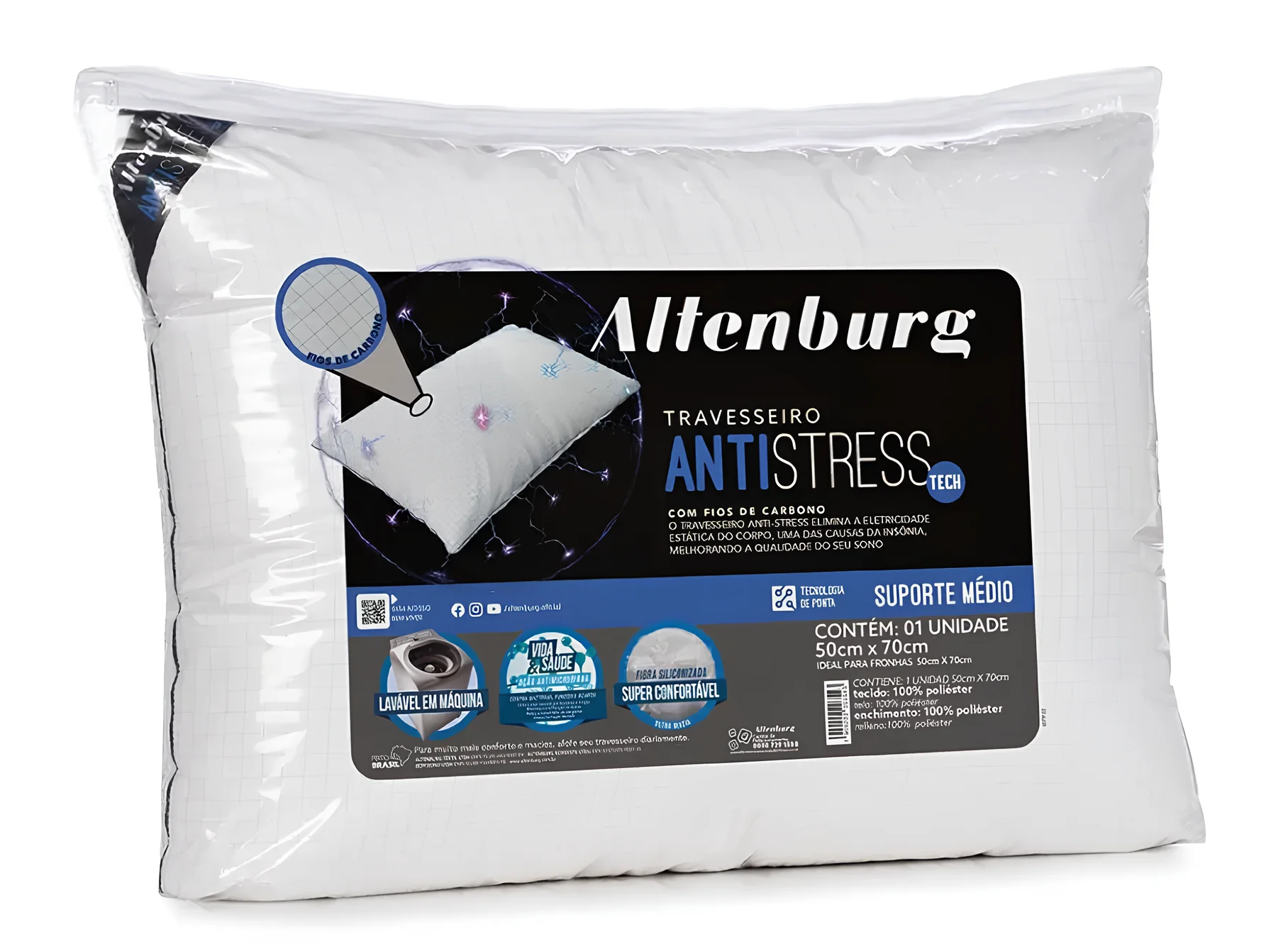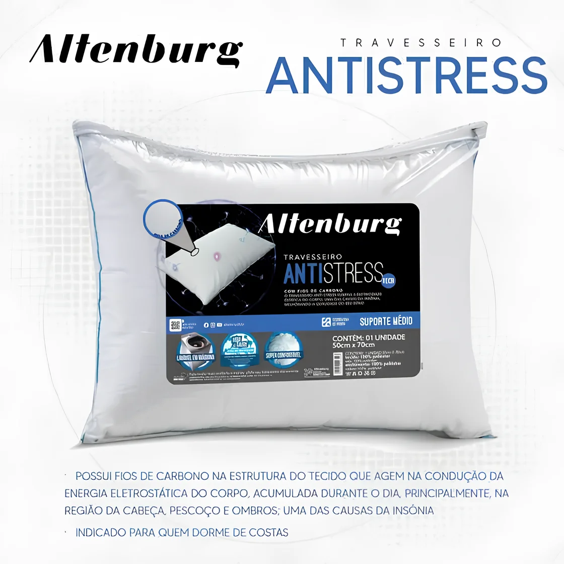 O Travesseiro Antistress possui fios de carbono na estrutura do tecido que agem na condução da energia eletrostática do corpo, acumulada durante o dia, principalmente, na região da cabeça, pescoço e ombros; uma das causas da insônia. O princípio antiestático do fio de carbono conduz a energia eletrostática do tecido ao ar, neutralizando a energia conduzida ao travesseiro. Com suporte médio, indicado para quem dorme de lado, garante uma qualidade de sono restauradora e relaxante.
