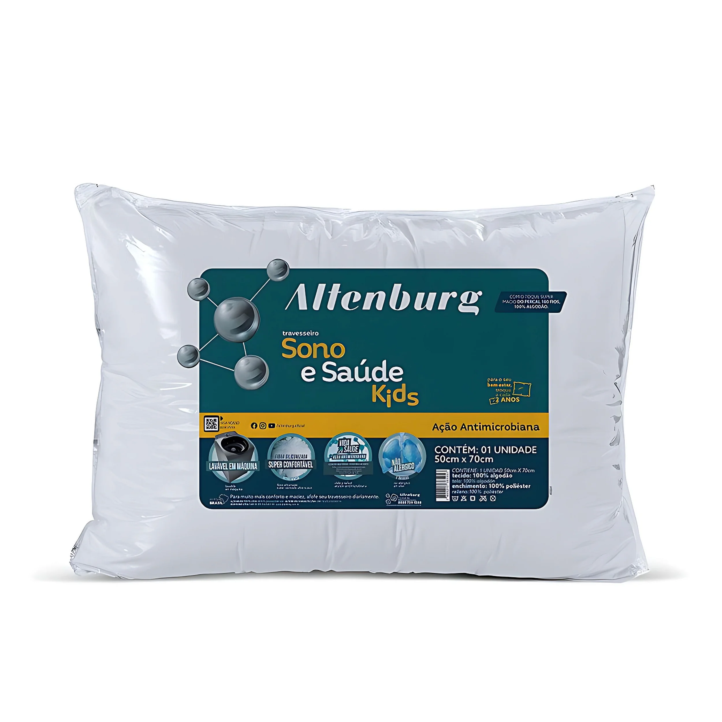 O travesseiro 50×70 Sono e Saúde Kids Altenburg é um produto indicado para crianças que apresentam sensibilidade respiratória. Ele possui um revestimento em percal 180 fios, 100% algodão, que é macio e confortável, e um recheio composto por fibra de poliéster especial siliconizada, com ação antimicrobiana.