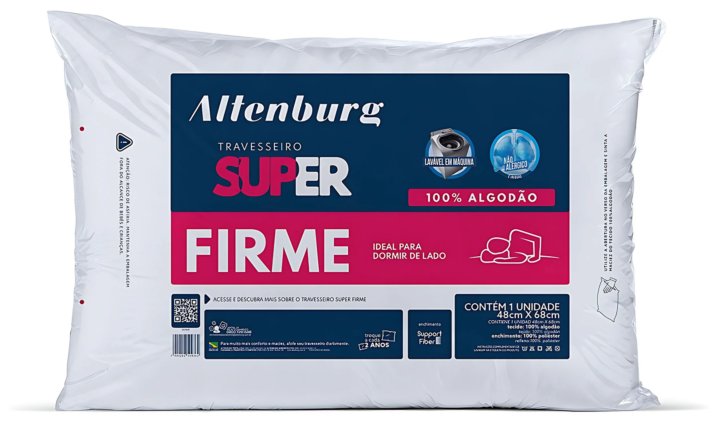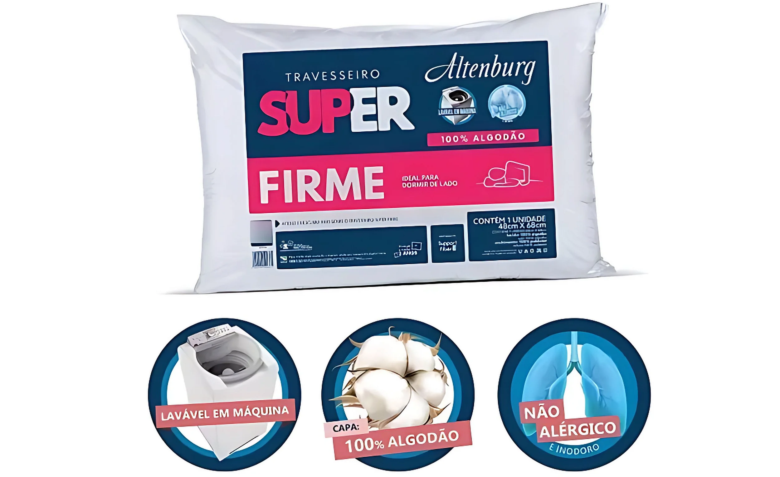 Pensando nisso, a Altenburg que é especialista em travesseiros, confeccionou o travesseiro suporte firme. A peça é ideal para quem dorme de lado, pode ser lavado a máquina e é antialérgico.