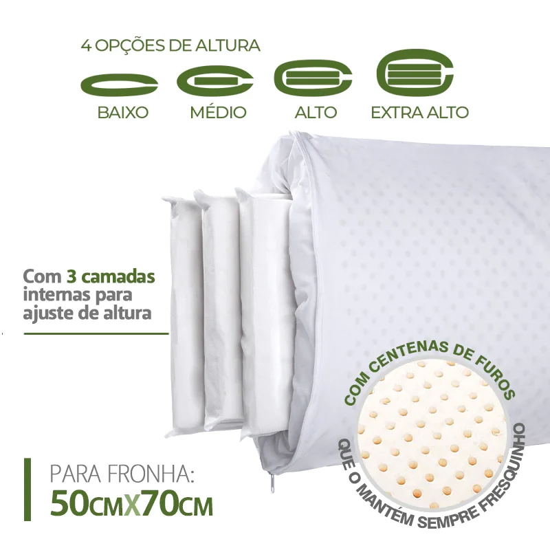 O travesseiro possui 3 camadas internas e o usuário pode a qualquer tempo escolher entre 4 alturas, bastando removê-las ou adicioná-las, de maneira fácil, rápida, prática e higiênica.
